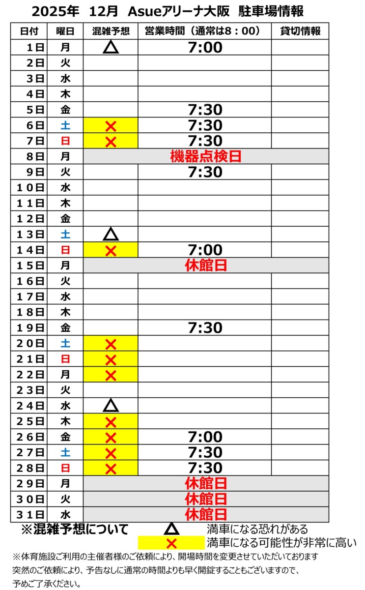 Asueアリーナ大阪 12月の駐車場営業時間変更のお知らせ