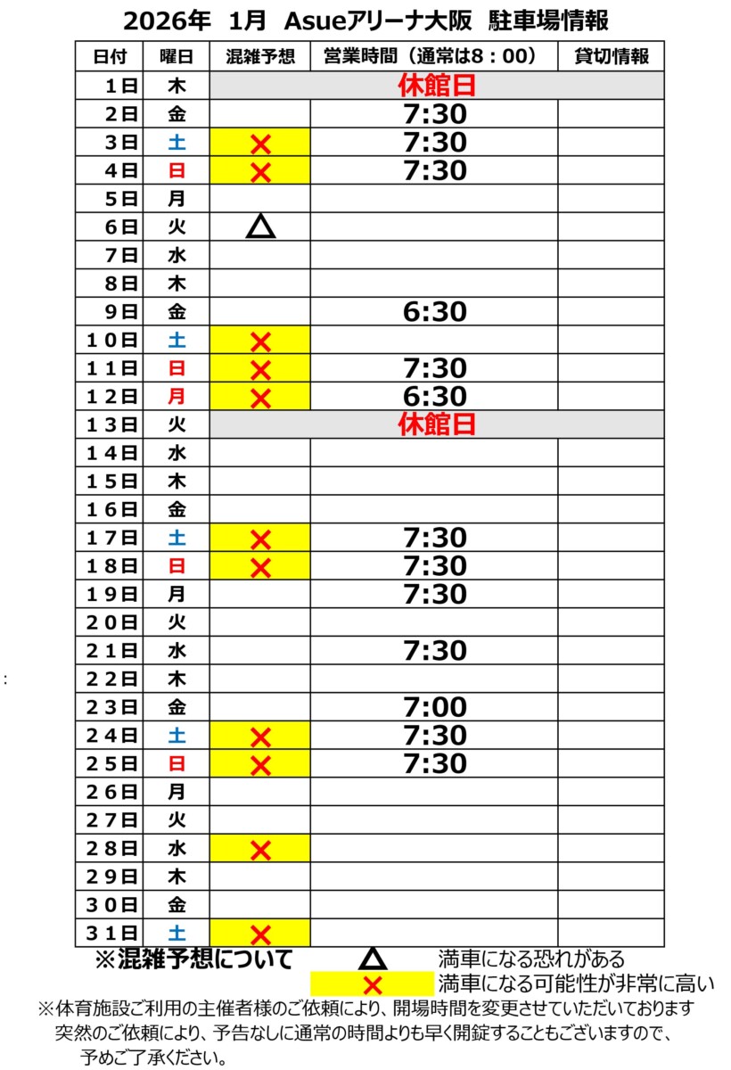 Asueアリーナ大阪 1月の駐車場の営業時間の変更をご案内します。